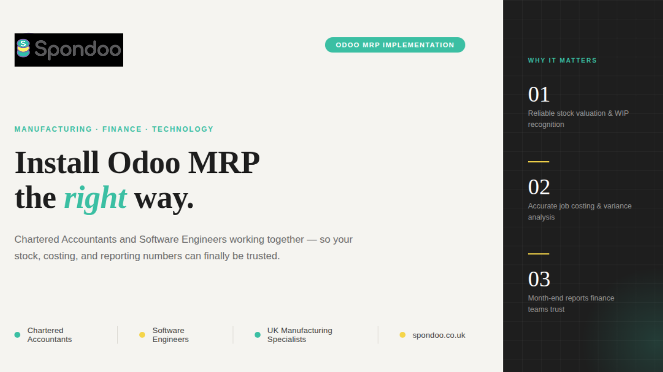 Need help installing Odoo MRP in the UK? Spondoo helps manufacturing businesses implement Odoo with the right mix of accounting control, software engineering discipline, and commercial understanding.